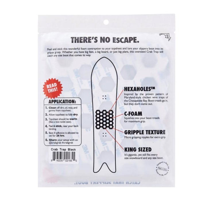 Stick this large format foam traction to your topsheet and lure your slippery boot into its grippy grasp. Whether you have big feet, a big board, or just big plans, this oversized trap will catch any size boot that comes its way. Inspired by the proven pattern of Maryland-style chicken wire traps of the Chesapeake Bay. Boot treads go in, but they don’t come out.