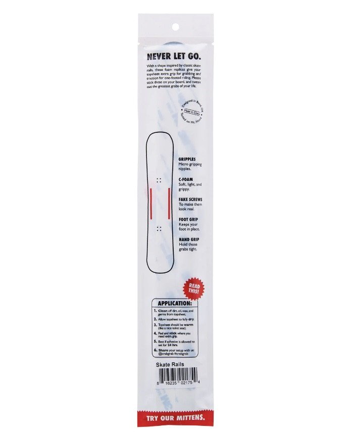 With a shape and design inspired by the classic skateboard rails of the 1980’s, these peel n’ stick foam rails offer your topsheet extra grip for grabbing, and traction for one-footed riding. We hope you stick these on your board, send it off a snow covered launch ramp, and tweak out the greatest grabs of your life.